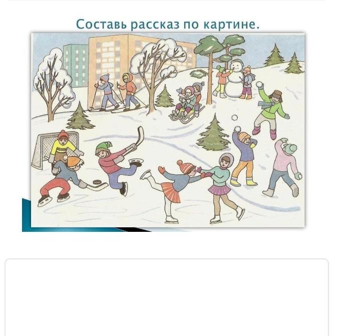 Ребята вышли во двор. Всем нашлось занятие по душе. Мальчик Витя в синей куртке и трико едет, проворно отталкиваясь лыжными палками по проложенной лыжне. Две подружки Катя и Надя слепили снеговика. Вместо носа у него вставлен корень петрушки. Руки – две ветки рябины, а на макушке – шляпа красивое ведёрко. Группа ребят увлеклись игрой: «Попади снежком в цель». Первоклассники взяли санки и спускаются с горы. На катке, плавно выписывает Таня рисунки по ледяной глади полозьями коньков. На заднем плане стоят дома, где живут семьи детей.
