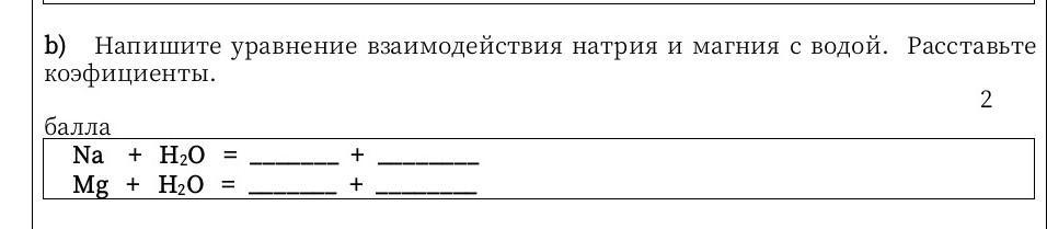 напишите уравнение взаимодействия натрия и магния с водой, расставьте коэффициенты, Na+H2O=..........+......... Mg+H2O=........ +..........