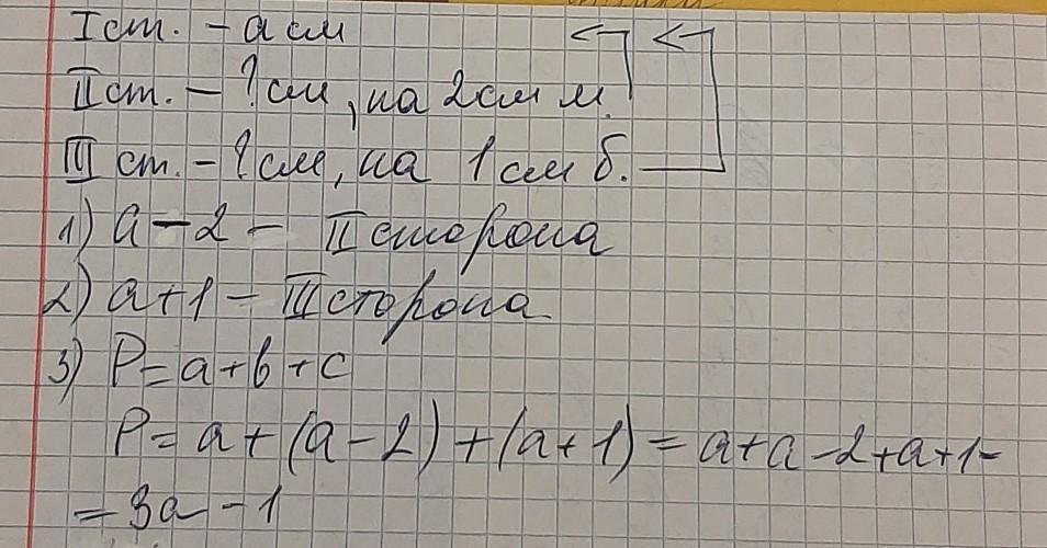 первая сторона треугольника равна а см,вторая сторона на 2 см меньше первой,третья сторона на 1 см больше,чем первая сторона,пожалуйста срочно