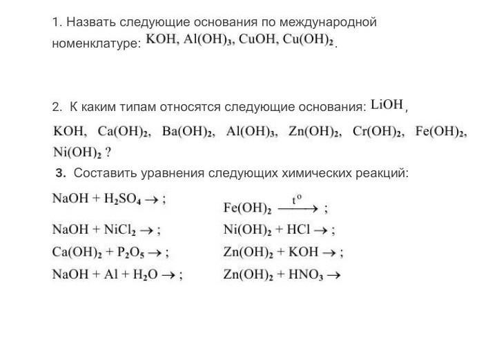 1. KOH - гидроксид калия, Al2(OH)3 - гидроксид алюминия, CuOH - гидроксид меди (I), Cu(OH)2 - гидроксид меди (II).