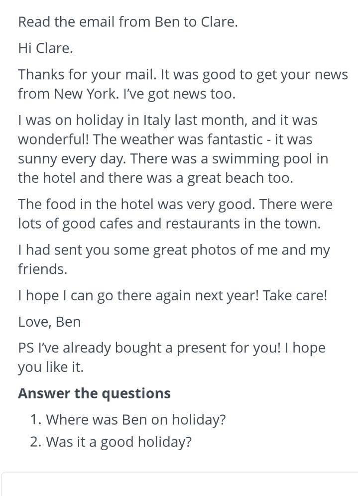 2) Yes, it was a wonderful holiday. He was crazy about the weather, facilities, hotel, beach and etc