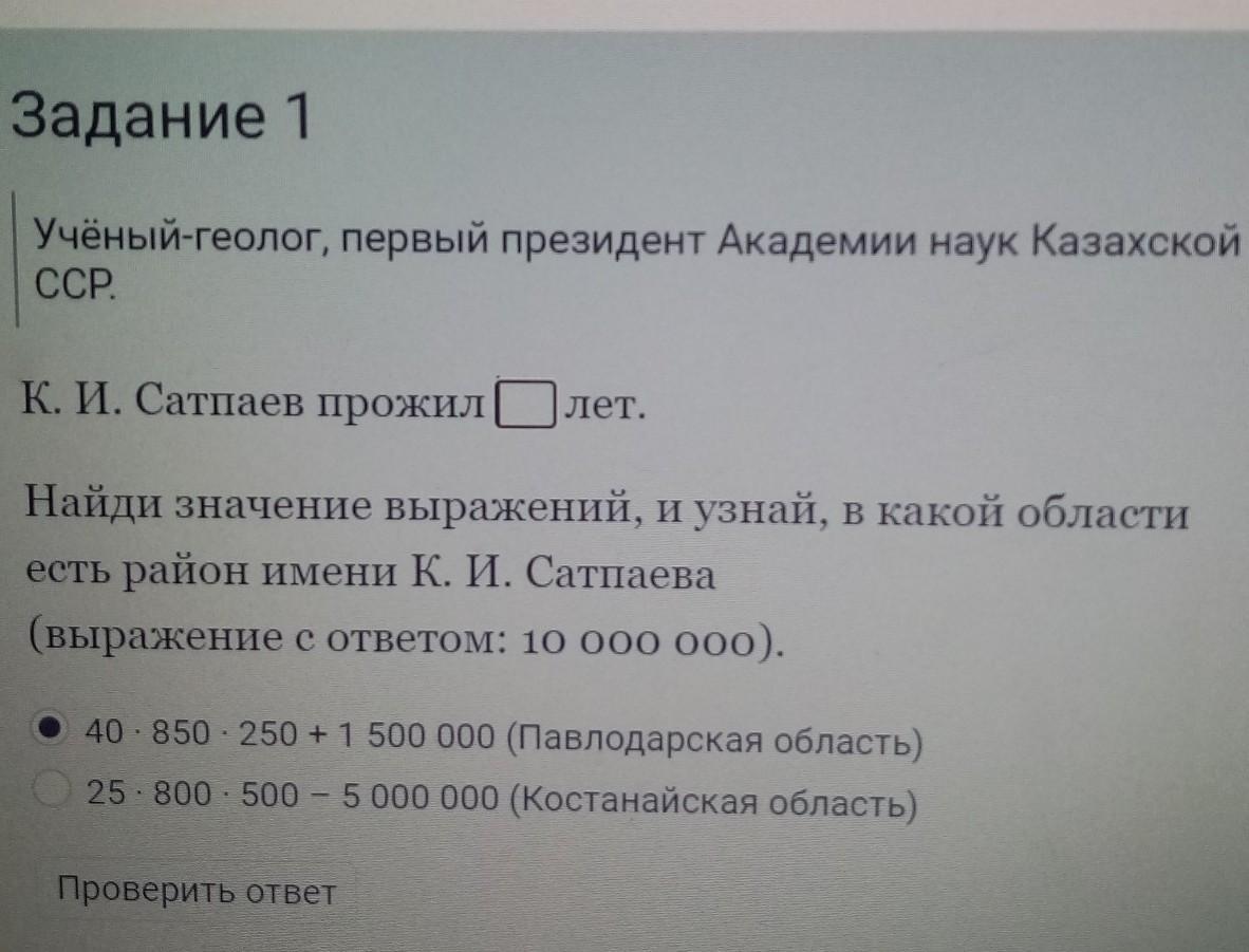Ответ: 1) К. И. Сатпаев прожил 64 года.