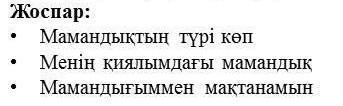 слова:мамандық түрі, болашақта,таңдау жасау,әр адамның қалауы, мамандақты сүю, пайдалы, қажетті