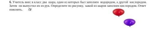 Красный шарик-заполнен водородом, потому-что водород легче воздуха, а фиолетовый шарик заполнен кислородом.