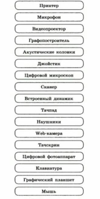 ввода-клавиатура,мышь, тачпад,граф. планшет, Джойстик,сканер,цифровой фотоаппарат,видеопроектор, вебкамера,микрофон.