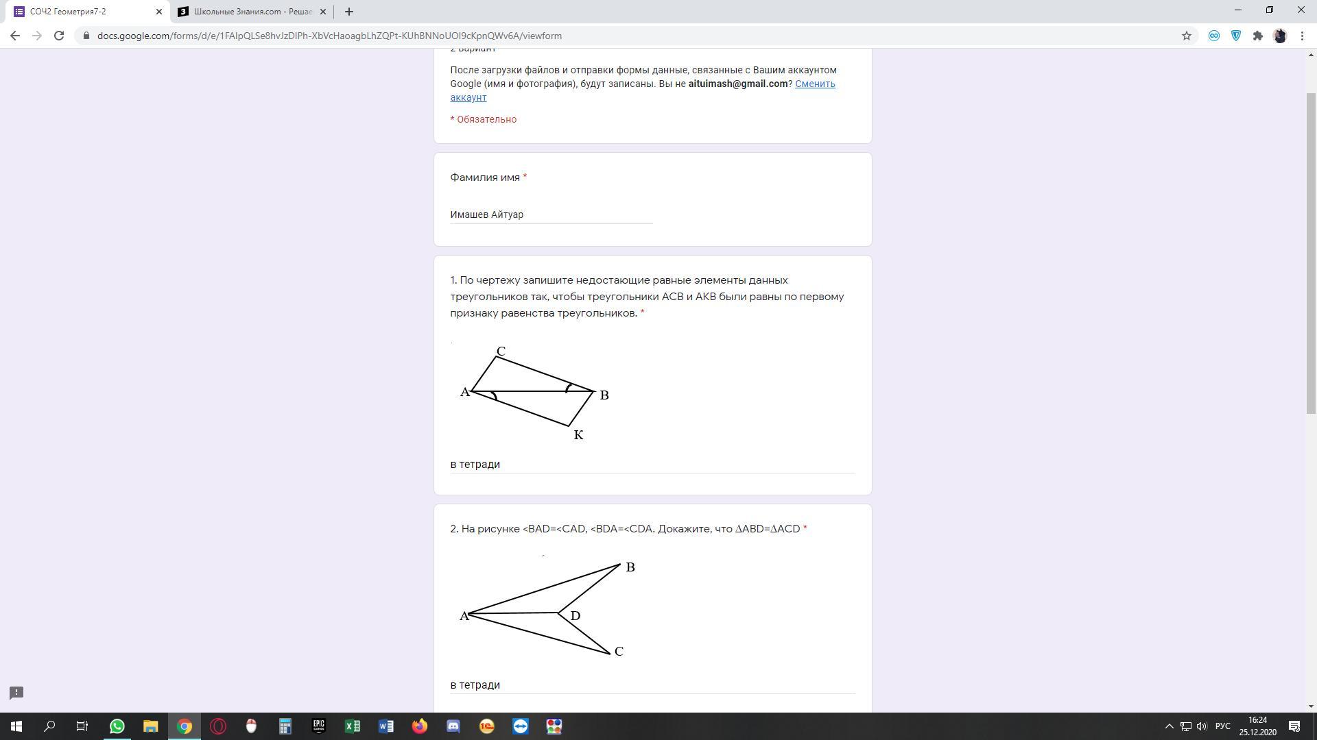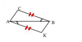 По чертежу запишите недостающие равные элементы данных треугольников так, чтобы треугольники АСВ и АКВ были равны по первому признаку равенства треугольников.