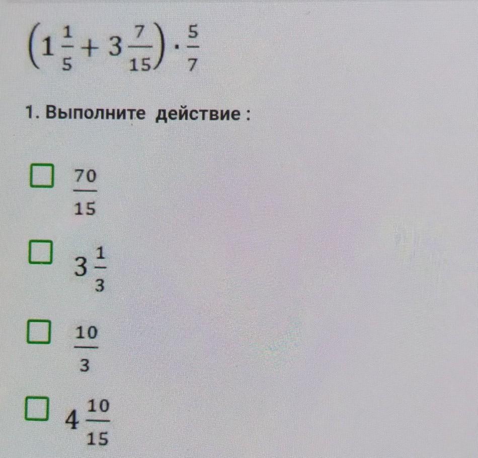 (1 1/5+3 7/15)×5/7. 1.выполни действие: 70/15, 3 1/3, 10/3, 4 10/15