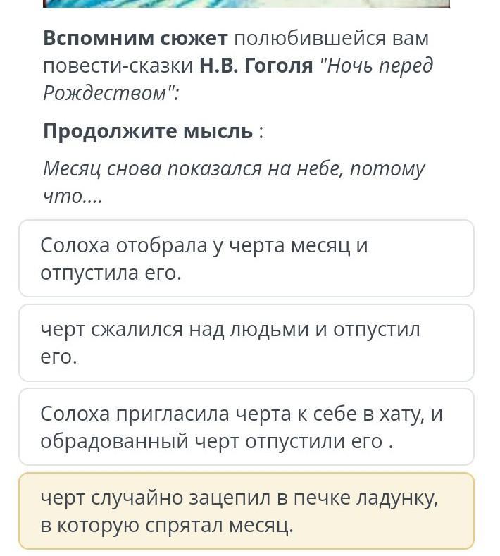 Месяц снова показался на небе, потому что чёрт случайно зацепил в печке ладунку, в которую спрятал месяц.