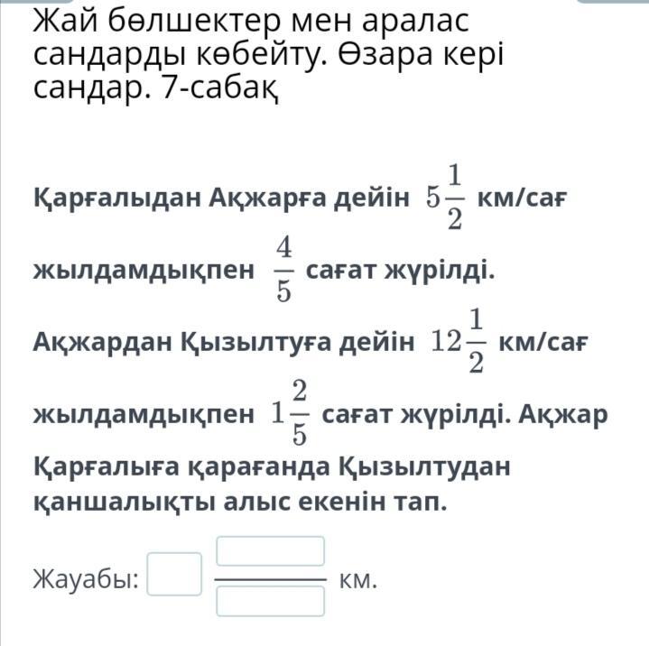 Жай бөлшектермен аралас сандар.7-сабақ. Қарғалыдан Ақжарға дейін км/сағ жылдамдықпен сағат жүрілді. Ақжардан Қызылтуға дейін км/сағ жылдамдықпен сағат жүрілді. Ақжар Қарғалыға қарағанда Қызылтудан қаншалықты алыс екенін тап. Жауабы:? км.