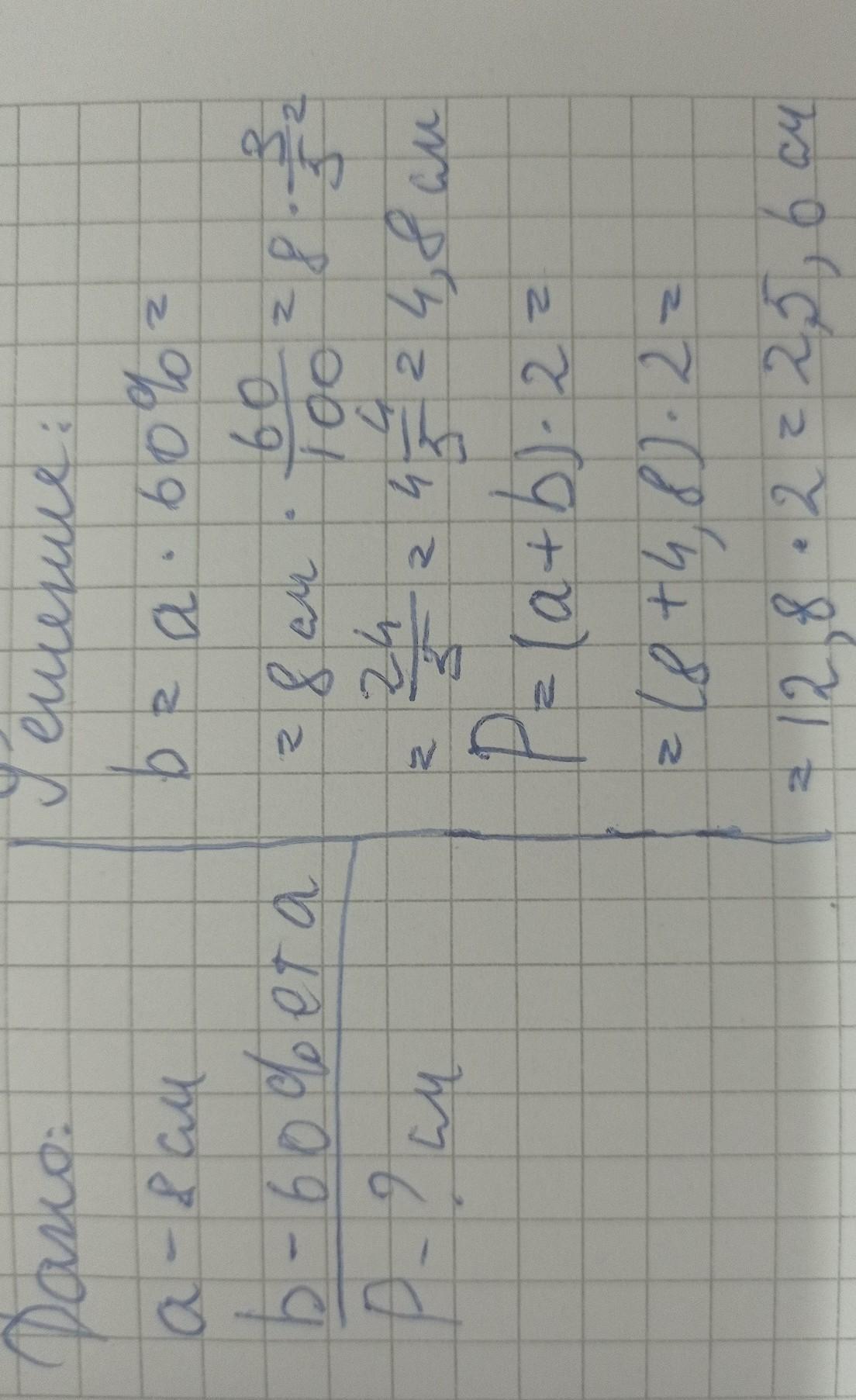 . Длина прямоугольника а см, а его ширина соcтавляет 60 % длины. Найдите периметр прямоугольника. Составьте буквенное выражение и решите задачу при а = 8 см