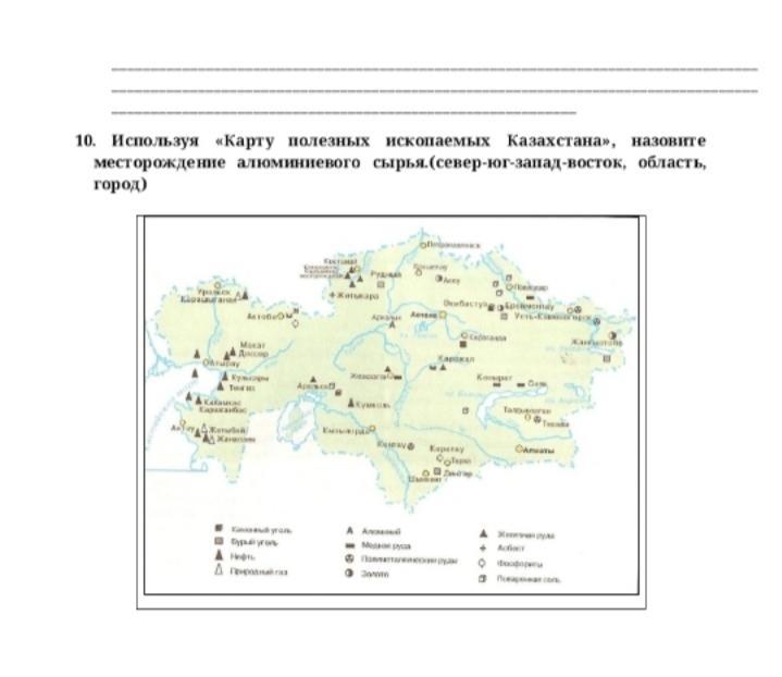 Используя "карту полезных ископаемых Казахстана" назовите местоположение алюменевого сырья (север-юг-запад-восток, область, город)