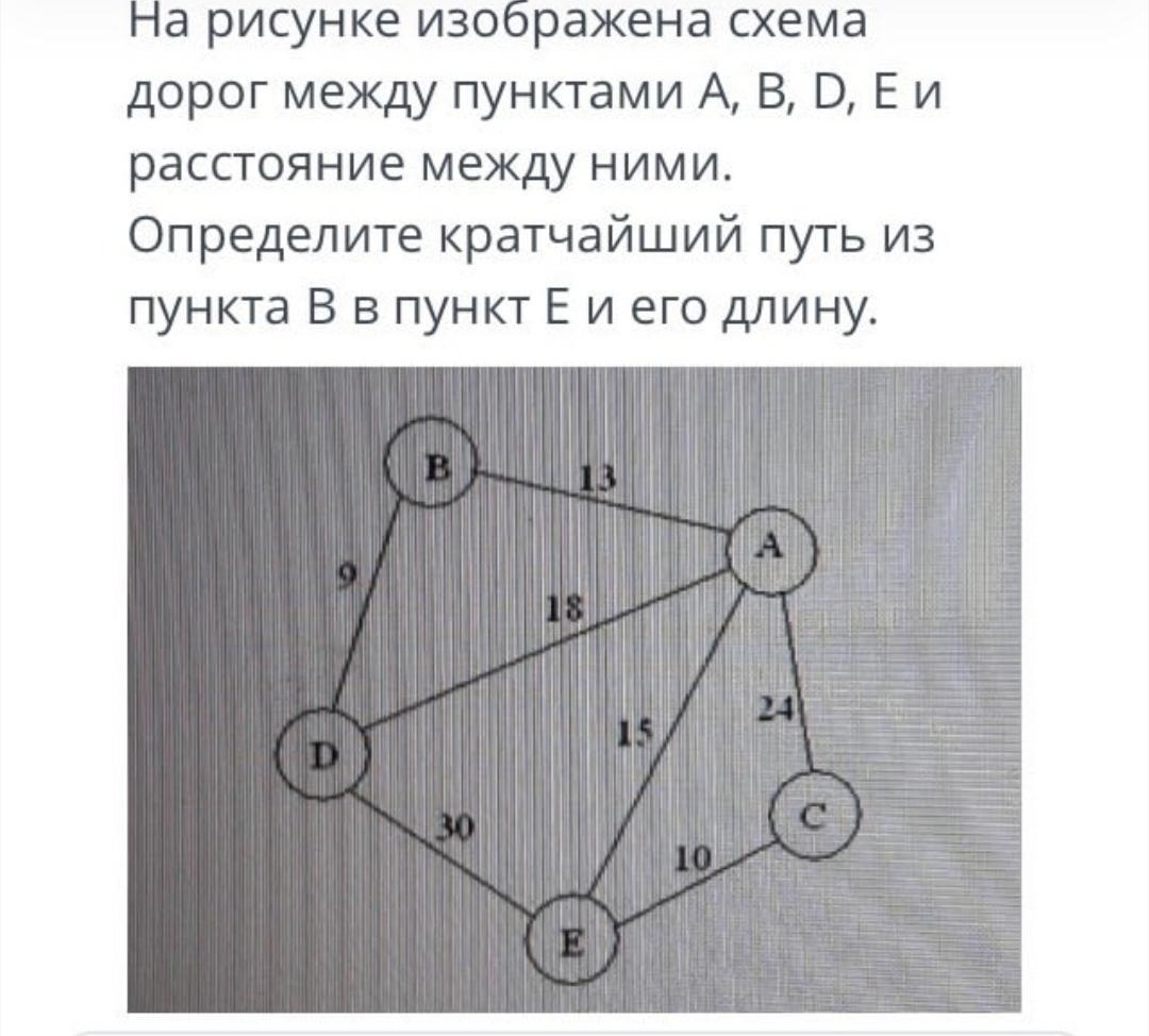 На рисунке изображена схема дорог между пунктами abde и расстояние между ними Определите кратчайший путь из пункта Б в пункт E и его длину