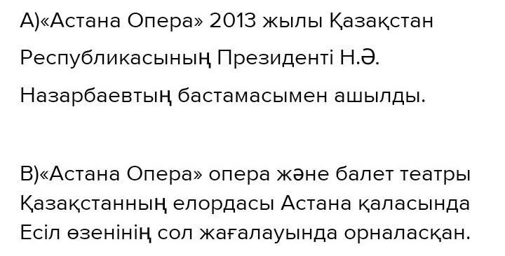 В)«Астана Опера» опера және балет театры Қазақстанның елордасы Астана қаласында Есіл өзенінің сол жағалауында орналасқан.