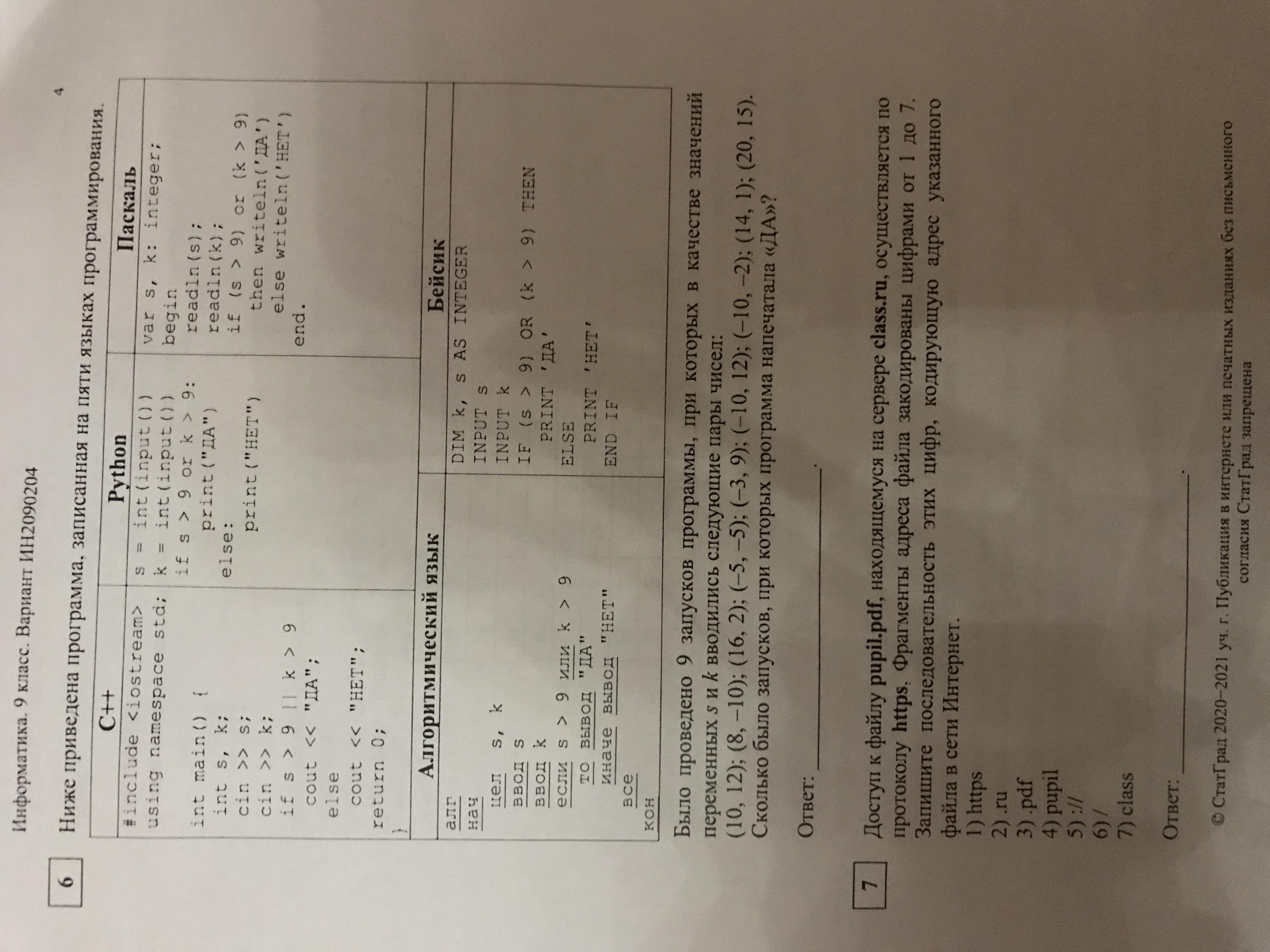 6. ответ 5 потому что команда or будет выполнятся даже если хотя бы одна из двух переменных > 9