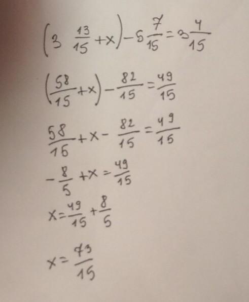 Пошаговое объяснение: 3 13/15+х=3 4/15+5 7/15