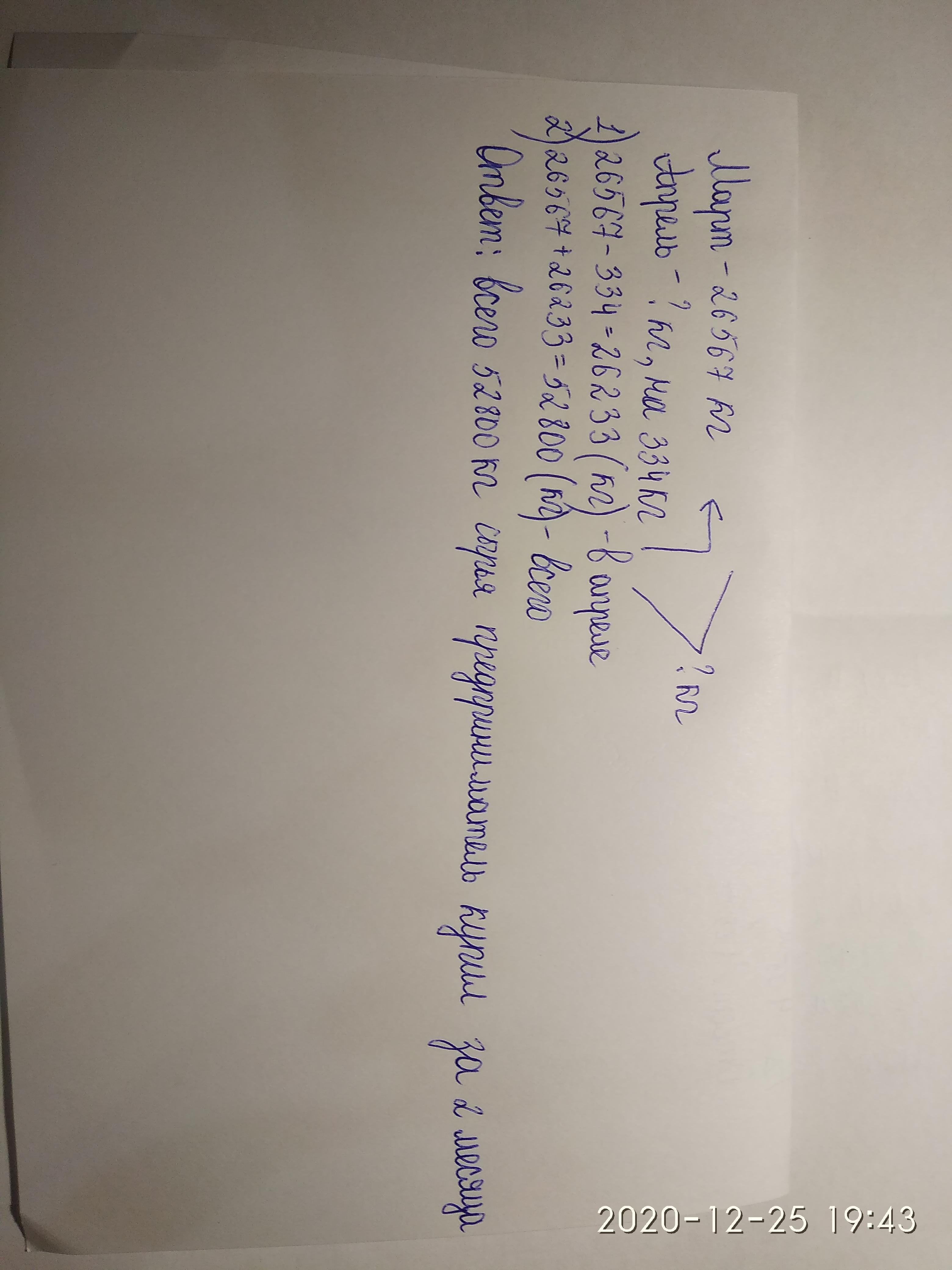 в марте предприниматель купил 26567 кг сырья в апреле на 334kg меньше, чем в марте. Сколько сырья купил предприниматель купил за эти два месяца?(вырази результат в тоннах)