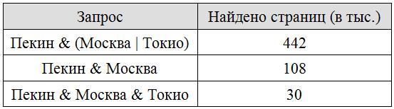 В таблице ниже приведены запросы и количество страниц, которые нашел поисковый сервер по этим запросам в некотором сегменте Интернета. Сколько страниц (в тыс.) будет найдено по запросу: Пекин & Токио?