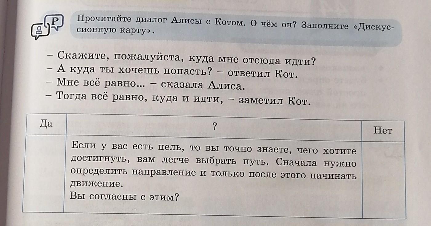 Прочитайте диалог Алисы с котом. О чём он? Заполните «Дискус-