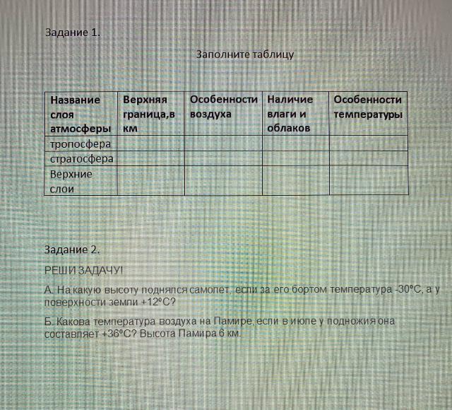 тропосфера- 8-20 км. воздух-80% всей массы воздуха. влага-почти вся влага и много облаков. темп-с высотой понижается.