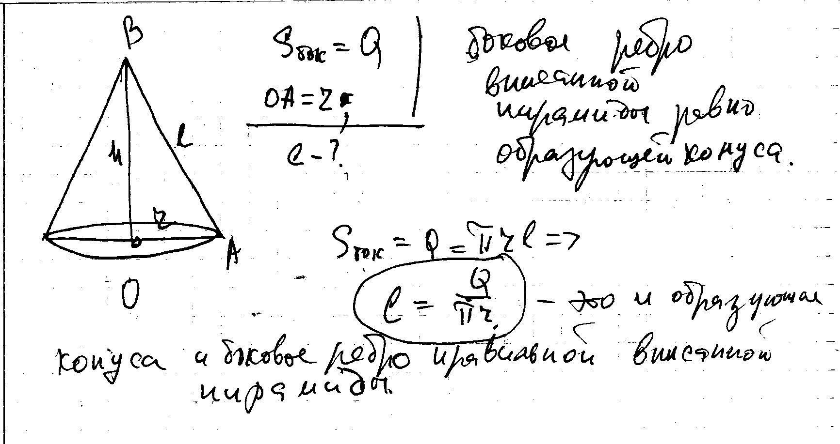 площадь боковой поверхности конуса Q, а его радиус r. Найдите длину бокового ребра вписанной в этот конус правильной треугольной пирамиды