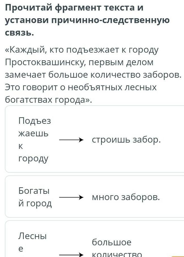 《Каждый, кто подъезжает к городу Простоквашинску, первым делом замечает БОЛЬШОЕ КОЛИЧЕСТВО ЗАБОРОВ. Это говорит о необъятных ЛЕСНЫХ БОГАТСТВАХ города.》.