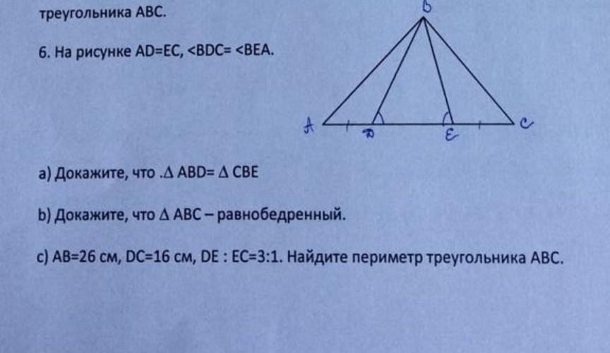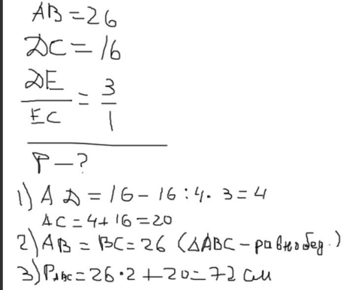 c) AB=26 см, DC-16 см, DE: EC=3:1. Найдите периметр треугольника ABC.
