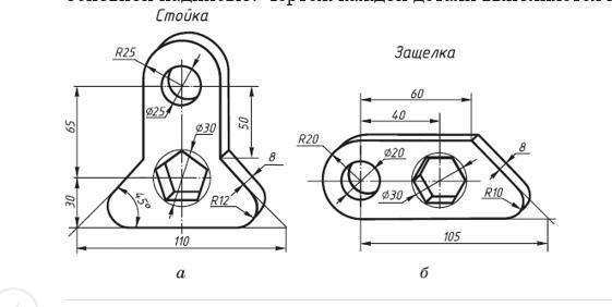 Для построения сопряжения слева и справа внизу детали я пометила расстояние до вспомогательных прямых 12 мм, их точка пересечения - центр сопряжения. Опустите из него перпендикуляры к прямым контура детали и можете проводить часть окружности для сопряжения.