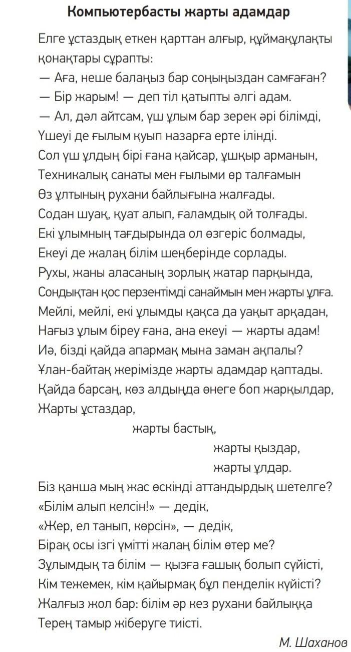 1. Қарияның неше ұлы бар ? 2. Ол бір баласын неге ерекше атайды ? з қалған екі ұлын не себепті ; « жарты адам » , – дейді ? 4. Олардың жарты басты болуына не себеп болған ? 5. Шетелге не үшін студенттерді жібердік ?