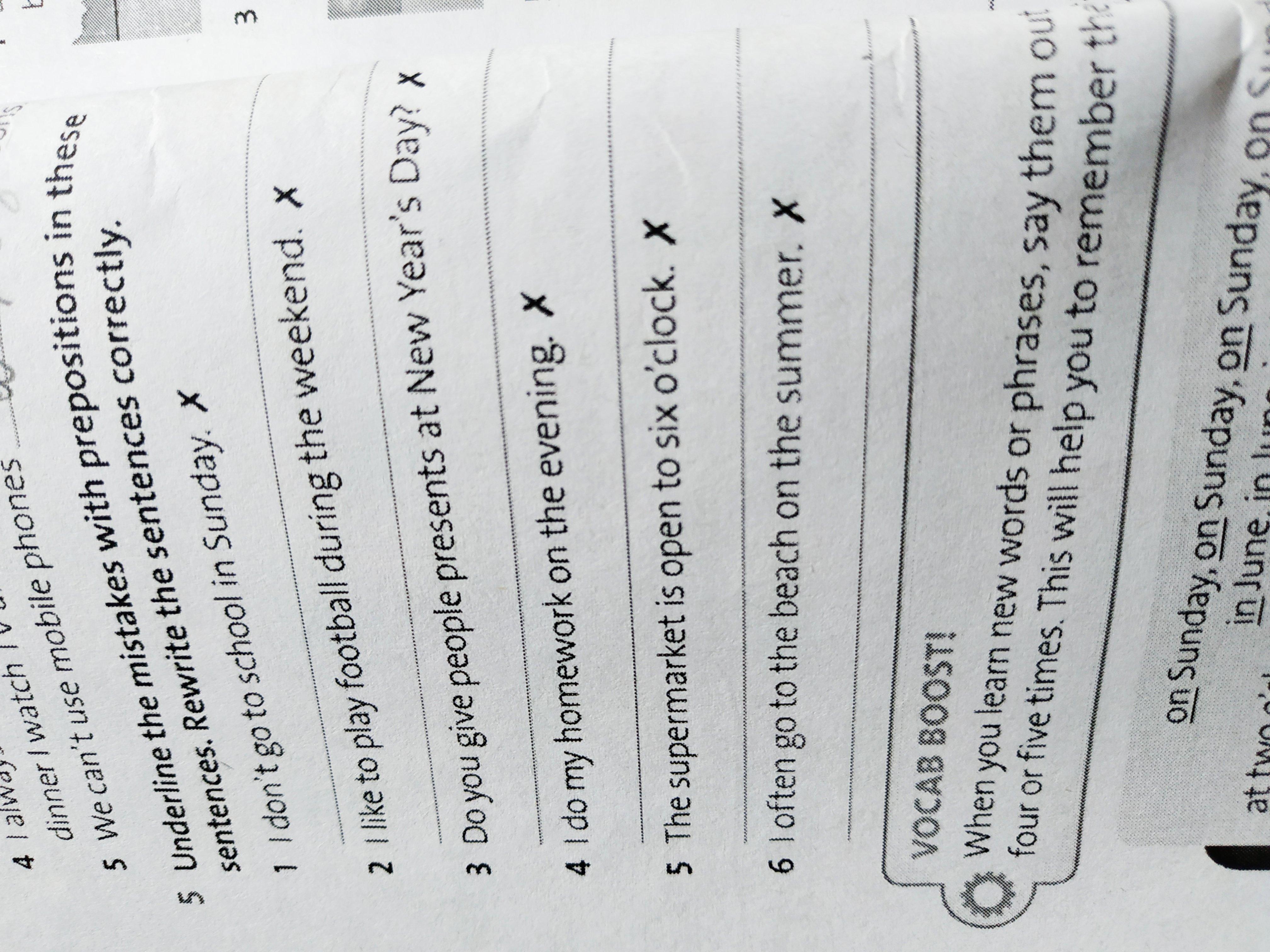5 Underline the mistakes with prepositions in these sentences. Rewrite the sentences correctly.