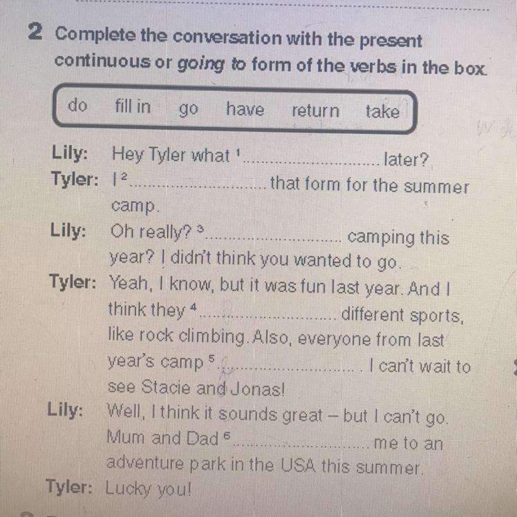 are you doing /am filling in/ Are you going / have / returns / are taking /