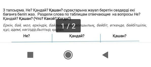 Не?: еркіндік, байлық, бейбіт, құс, қыран. Қандай?: еркін, бай,мол, молшылық, бейбітшілік, әдемі, көгілдір. Қашан?:кеше, өткенде, былтыр