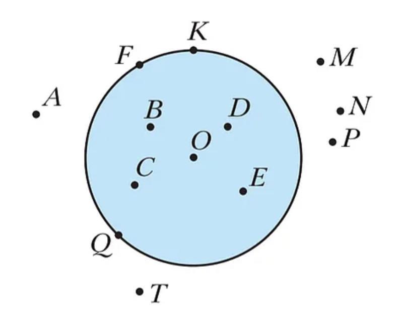 На рисунке изображён круг с центром O Записываю точки в порядке возрастания Без пробелов разделяя их точкой и запятой.Из отмеченных точек кругу принадлежат точки(_____),кругу не пренадлежат точки(_____);окружности,ограничивающей этот круг пренадлежат точки(_____)