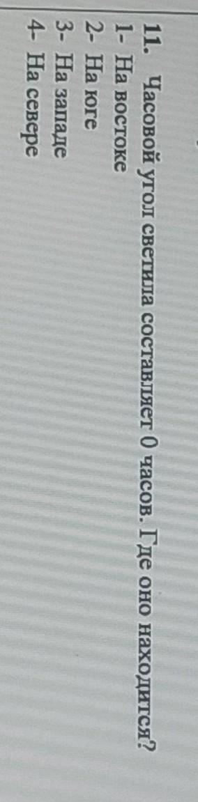 Часовой угол светила составляет 0 часов. Где находится оно? Часовой угол показывает, сколько времени прошло после верхней кульминации. Если часовой угол 12 часов, то светило находится на севере, если 0 часов - на юге.