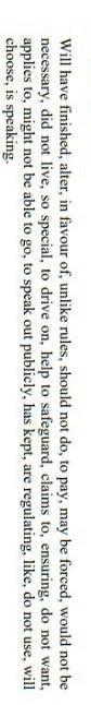 Will have finished, alter, in favour of, unlike rules, should not do, to pay, may be forced, would not be necessary, did not live, so special, to drive on, help to safeguard, claims to, ensuring, do not want, applies to, might not be able to go, to speak out publicly, has kept, are regulating, like, do not use, will choose, is speaking.