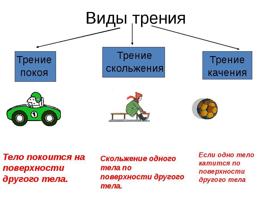 Взаимодействие, которое возникает в месте соприкосновения двух тел и препятствует их относительному движению, называют трением. А силу, которая характеризует это взаимодействие, называют силой трения. Различают три вида трения: трение скольжения, трение покоя и трение качения.
