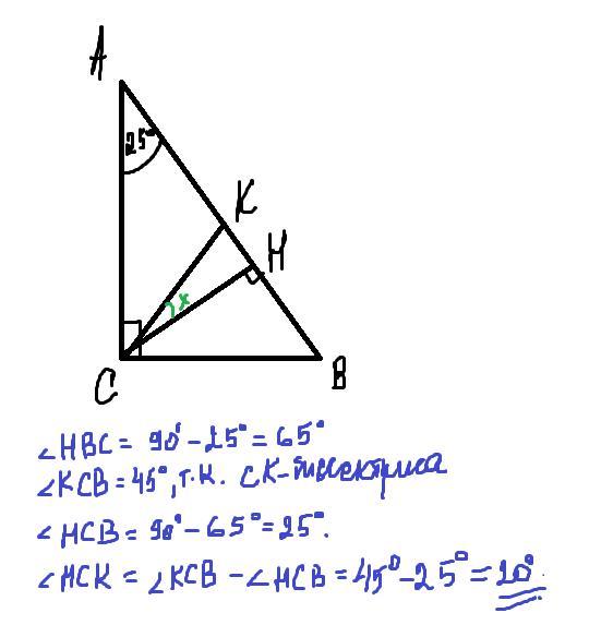 Дано: ΔABC, СH –– высота, СК –– биссектриса. Угол А равен 25⁰, а угол С равен 90⁰. Найти величину угла HCK.