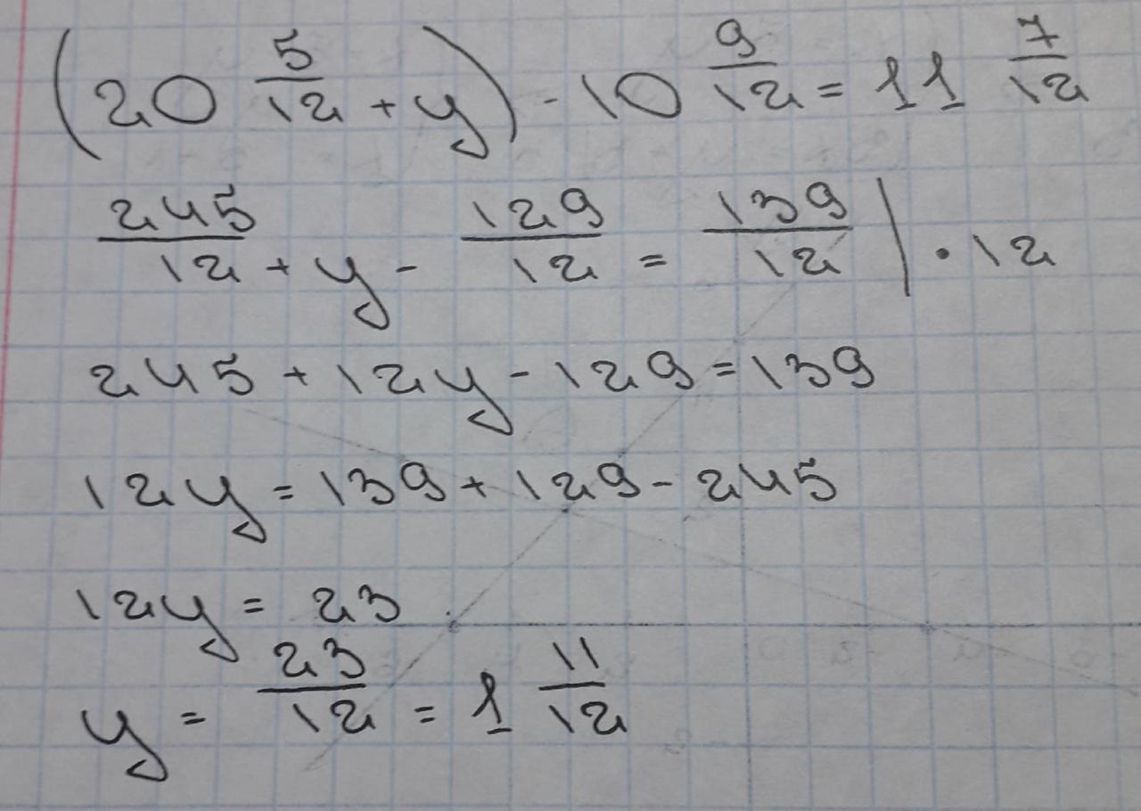 (20 5/12 + y) - 10 9/12 = 11 7/12