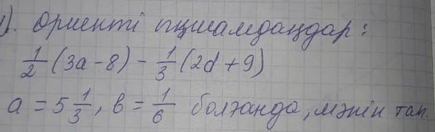 1/2(3а-8)- 1/3(2b+9)= 3/2а-4-2/3b-3= 3/2а-2/3b-7=3/2*5 1/3-2/3*1/6-7=