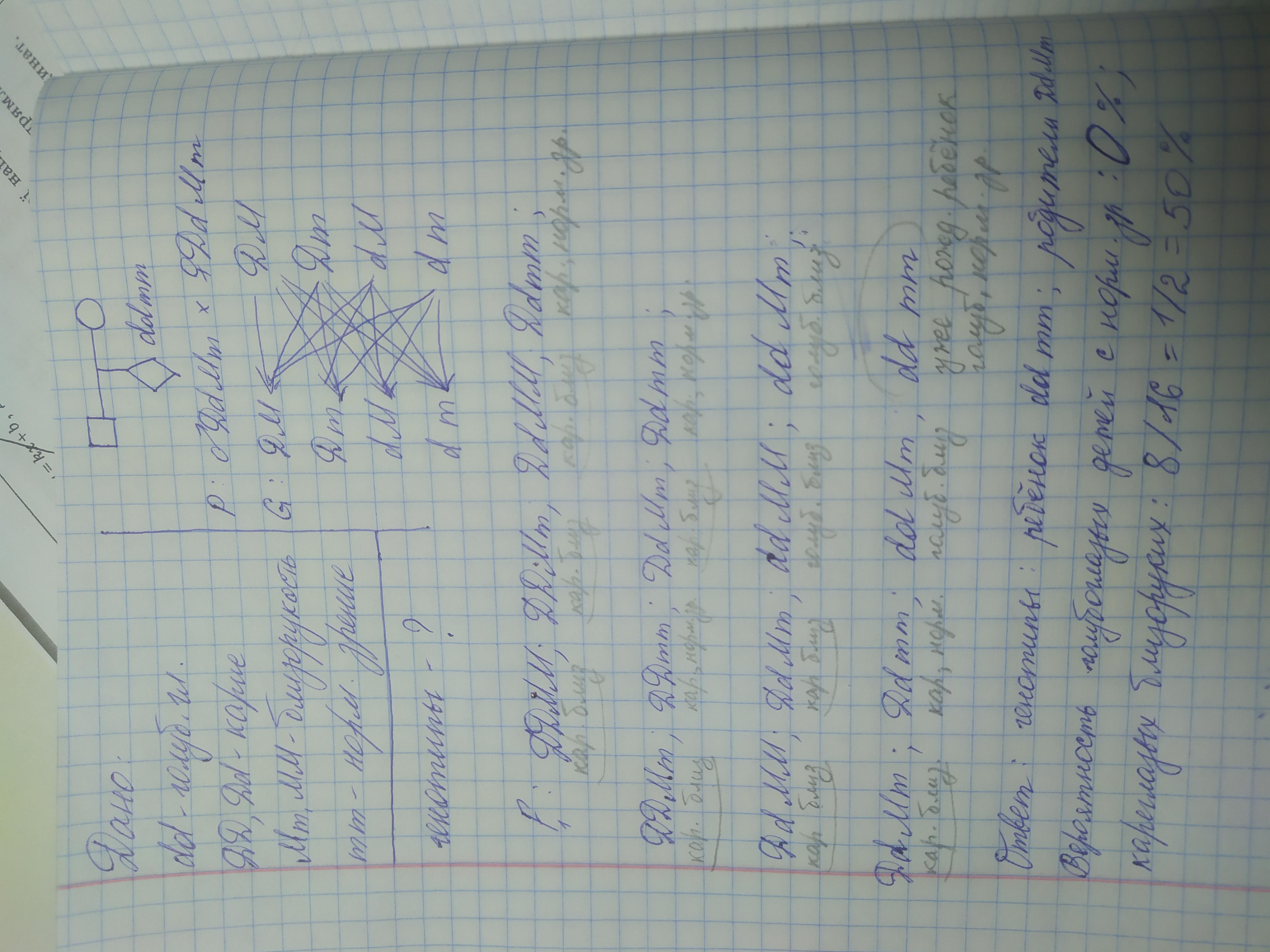 Единственный ребёнок близоруких кареглазых родителей имеет голубые глаза и нормальное зрение. Установить генотипы всех трёх членов этой семьи. С какой вероятностью в этой семье могут родиться ещё дети с голубыми глазами и нормальным зрением, а также- кареглазые близорукие?