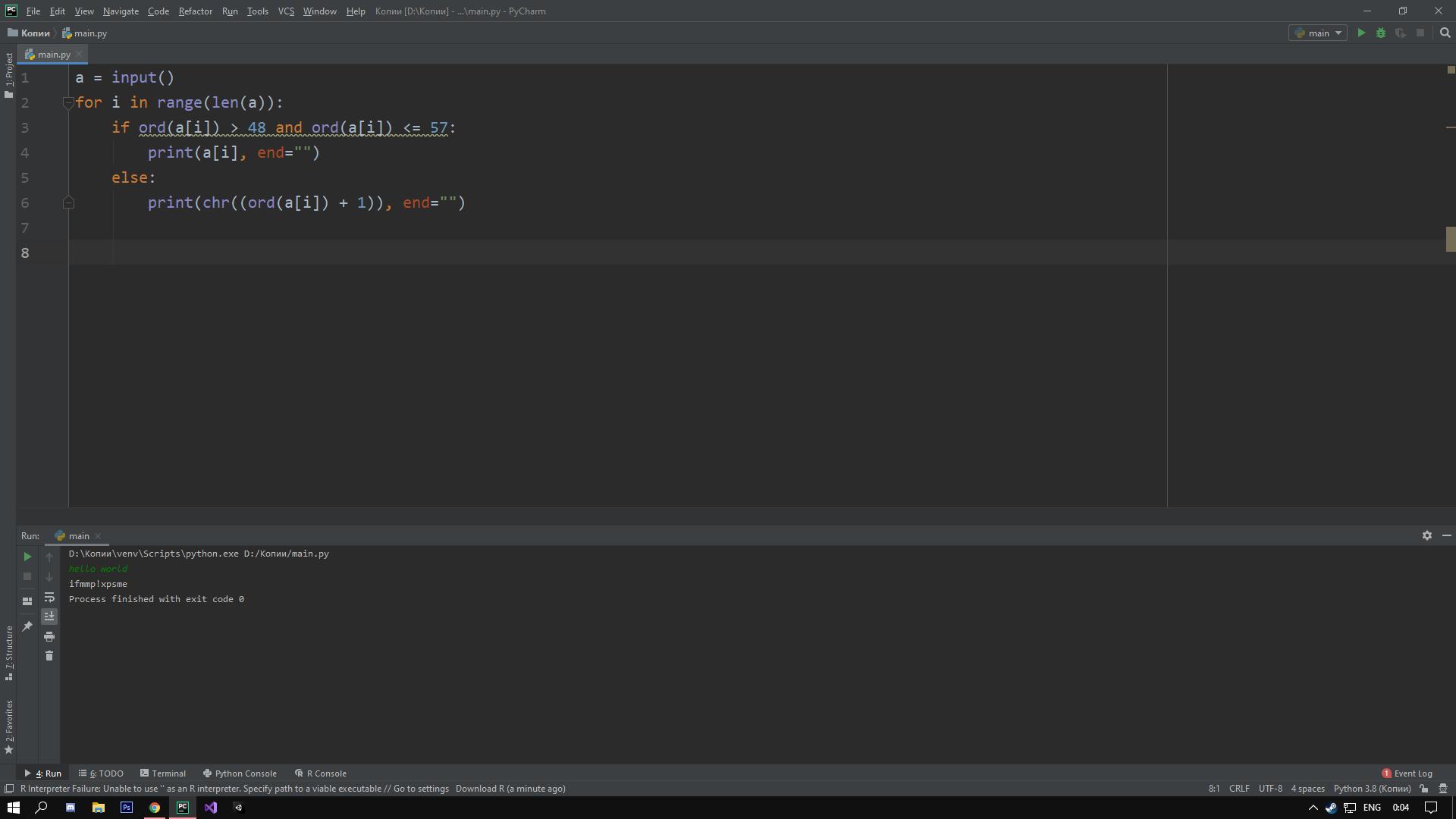 Напишите программу на Python (2.7.5) в которой пользователь будет вводить символы в строку, а эта программа будет выводить цифры (если они есть) и выводить каждый символ из введенных со сдвинутым на единицу кодом (по ASCII).