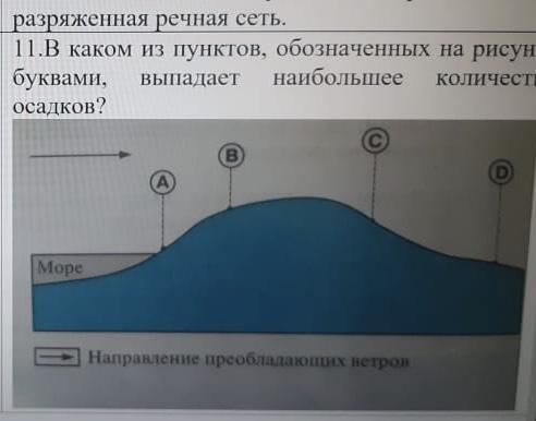 Осадков будет выпадать больше всего с наветренной стороны.Поэтому на рисунке это будет пункт В.Это связано с тем, что гора служит барьером для прохождения облаков внутрь суши.