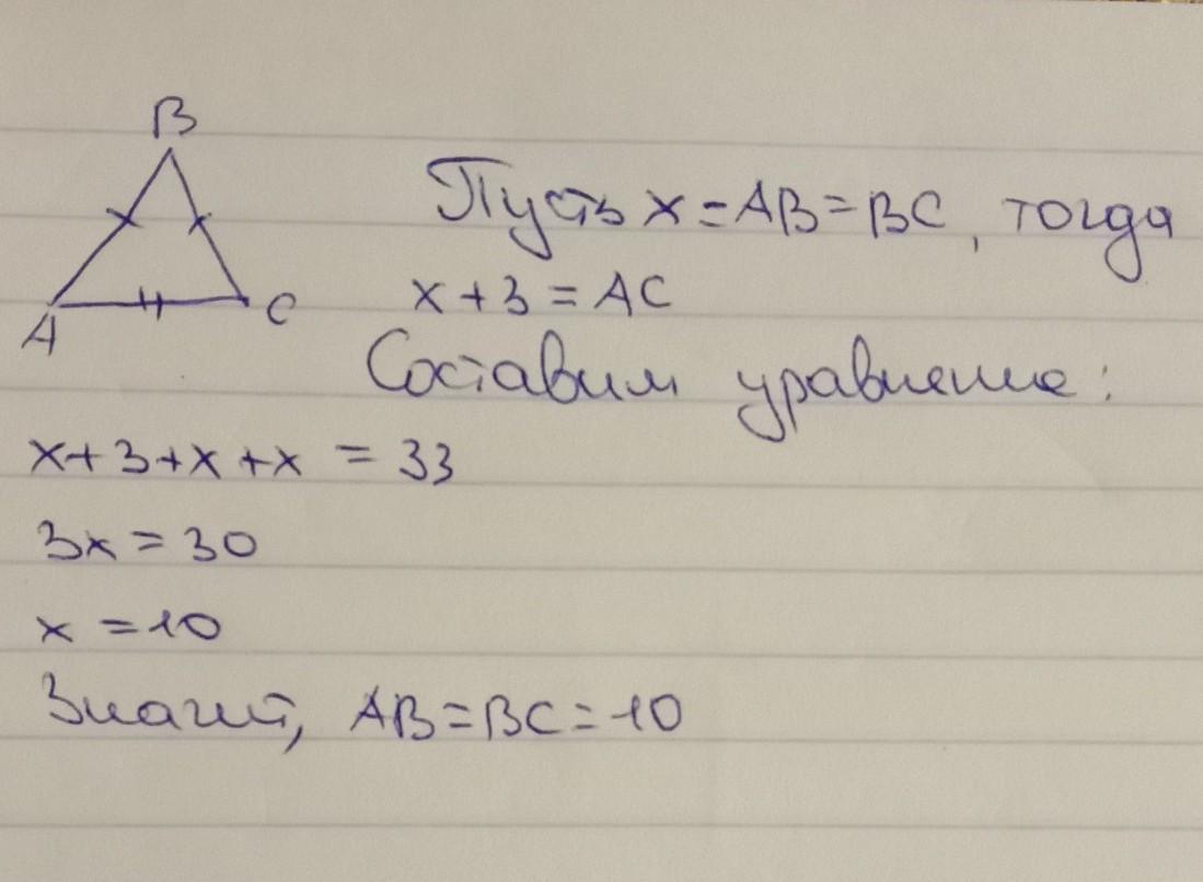 найдите стороны равнобедренного треугольника, если его периметр равен 33см, основание- на 3мм больше боковой стороны, боковая сторона-?