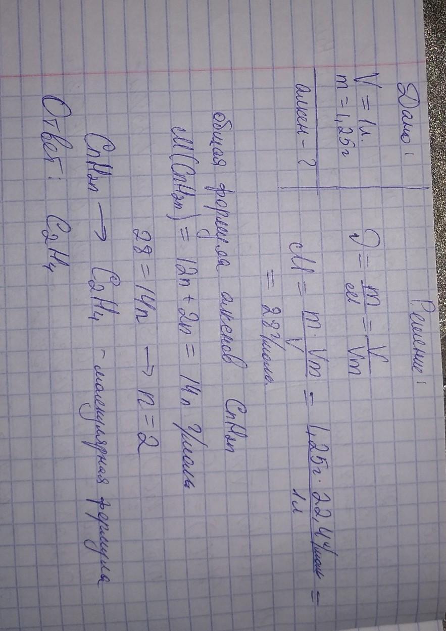 Алкен объемом 1 л при нормальных условиях имеет массу 1,25 г. Найдите его молекулярную формулу,