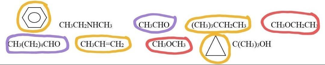 Желтым обведены углеводороды, фиолетовым - альдегиды, красным - эфиры. Вещества, которые не обведены, на мой взгляд, не относятся ни к одному классу из приведённых в вашей задаче.