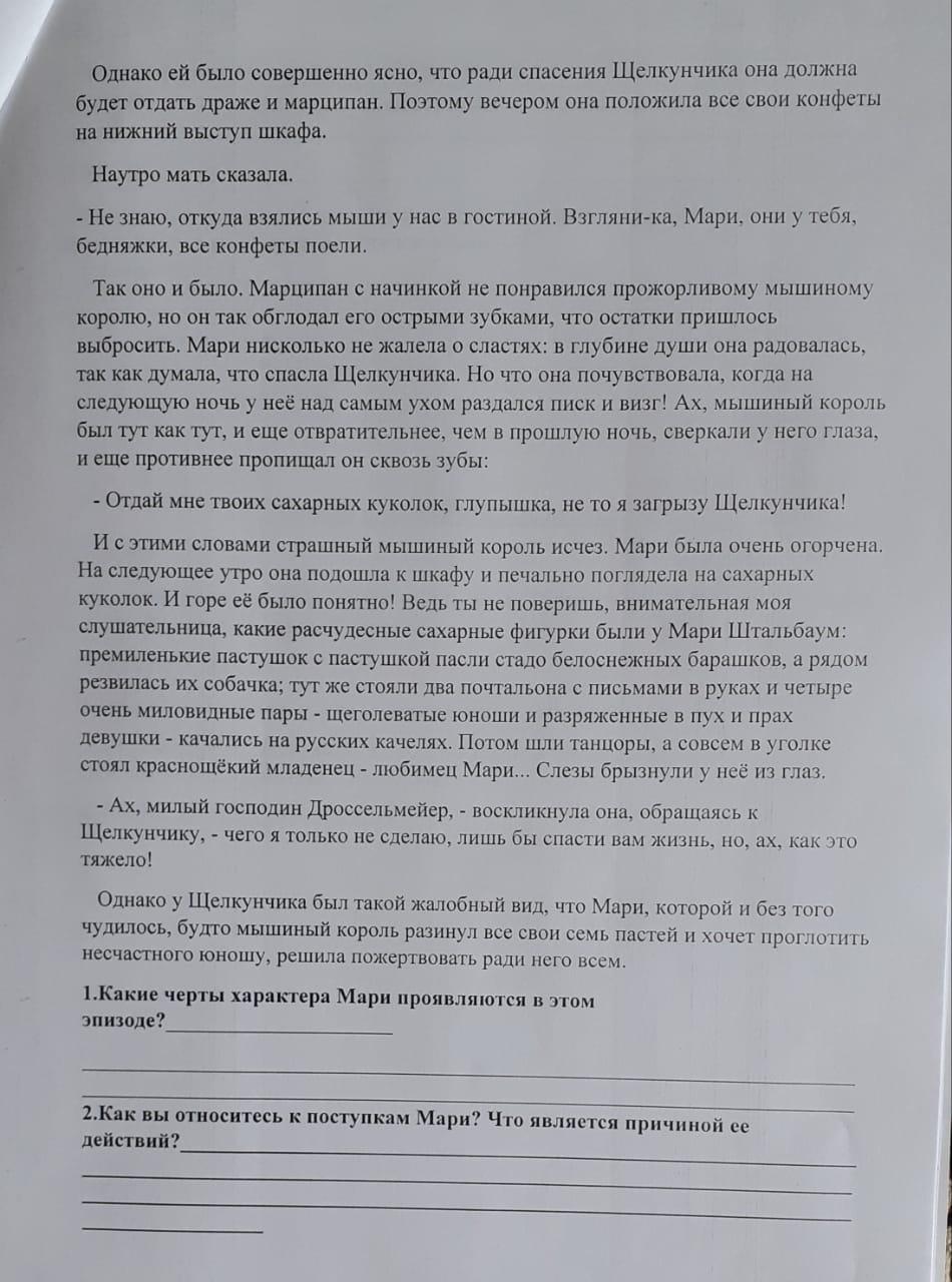 2. Я считаю поступок Мари благородным и заслуживающим похвалы. Потому что истинной причиной такого поступка девочки были не личный интерес или стремление прославиться, кому-то понравиться, а ее честное, доброе отношение к Щелкунчику и желание ему помочь.