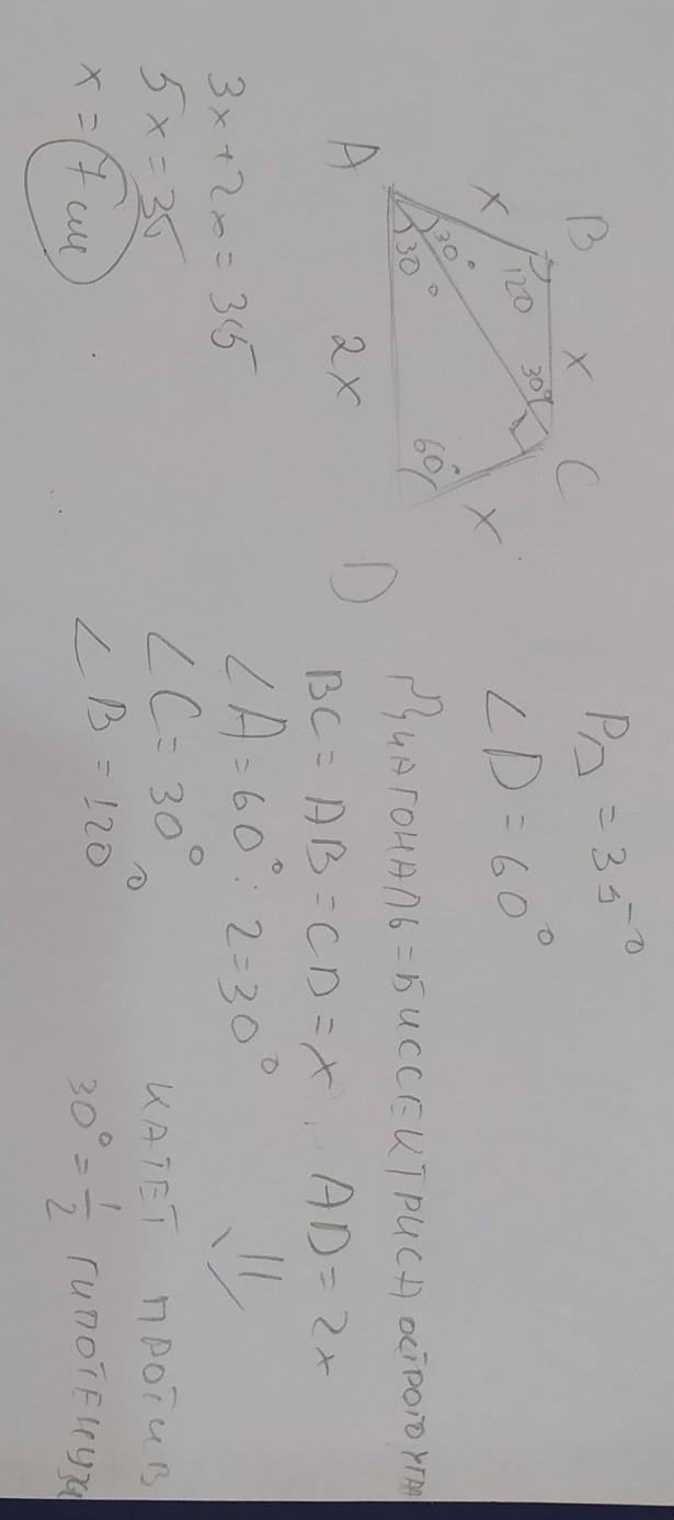 В трапеции АВСD диагональ АС перпендикулярна боковой стороне СD и является биссектрисой угла А. Найдите длину АВ, если периметр трапеции равен 35 см, угол D равен 60˚.