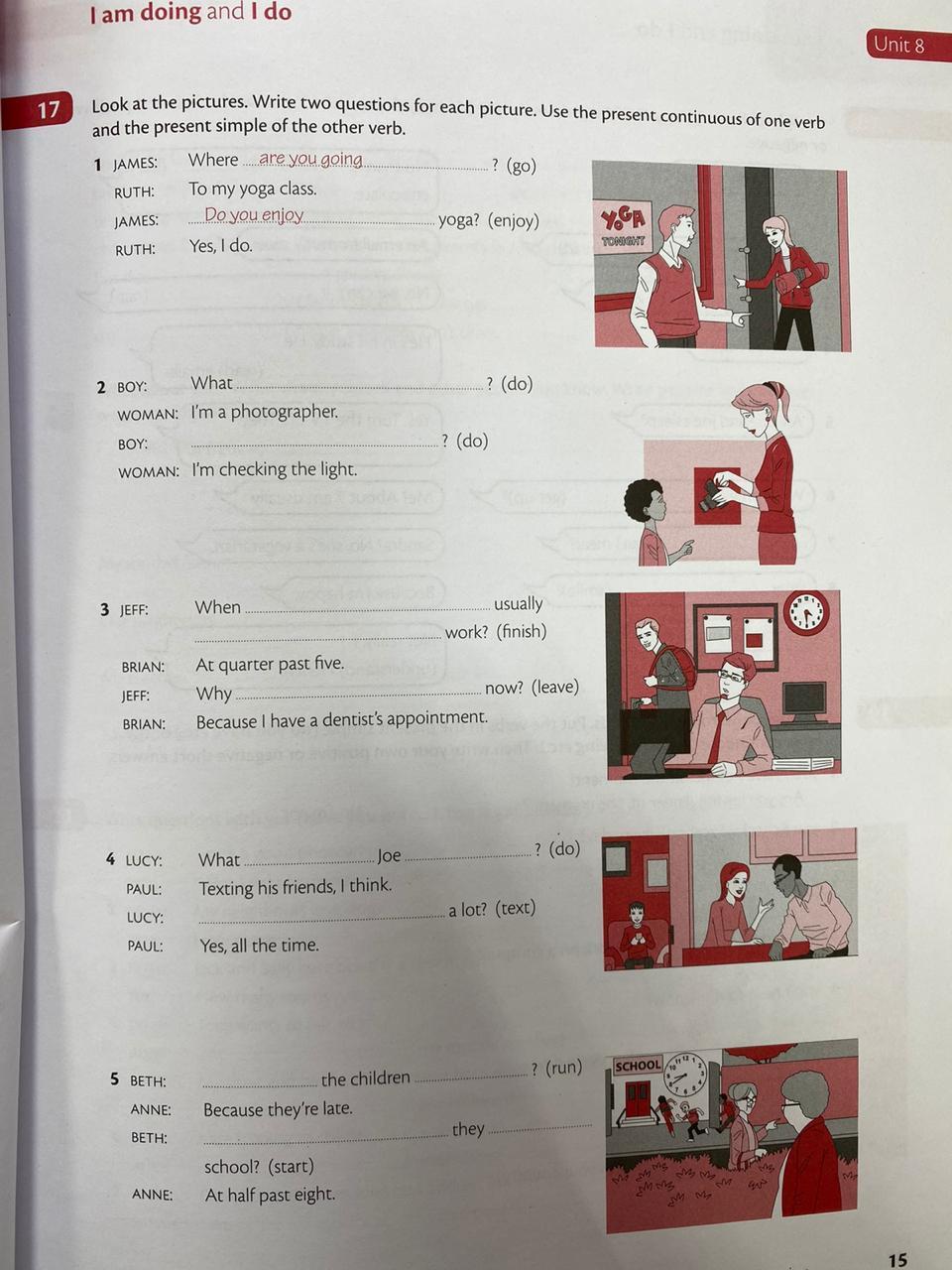 посмотрите на картинки.Напишите два вопроса для каждой картинки.Используйте настоящее непрерывное одного глагола и Настоящее простое другого глагола