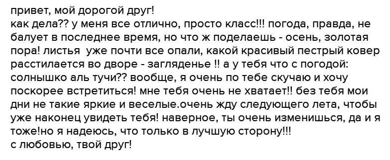 Здравствуй, Антон. Прошло пол года, как ты переехал в другой город. С того времени как ты уехал многое в классе поменялось. С первого сентября к нам в класс перешли три новых ученика. Две девочки и один мальчик. Одна девочка занимается балетом, другая ходит в музыкальную школу. Но главное приобретение нашего класса это Сергей, он очень хорошо играет в футбол. Так что теперь наша команда стала сильнее. В следующий раз, когда приедешь, обязательно сыграем вместе.