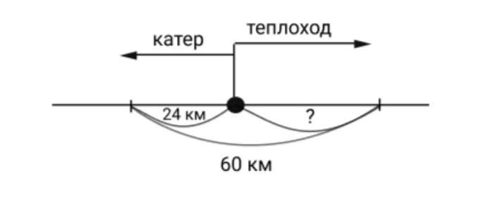 от причала одновременно в противоположных напровлениях вышли катер и теплоход когда катер прошол 24км со скоростью 8км/ч растояние между суднами стало 60км с какой
