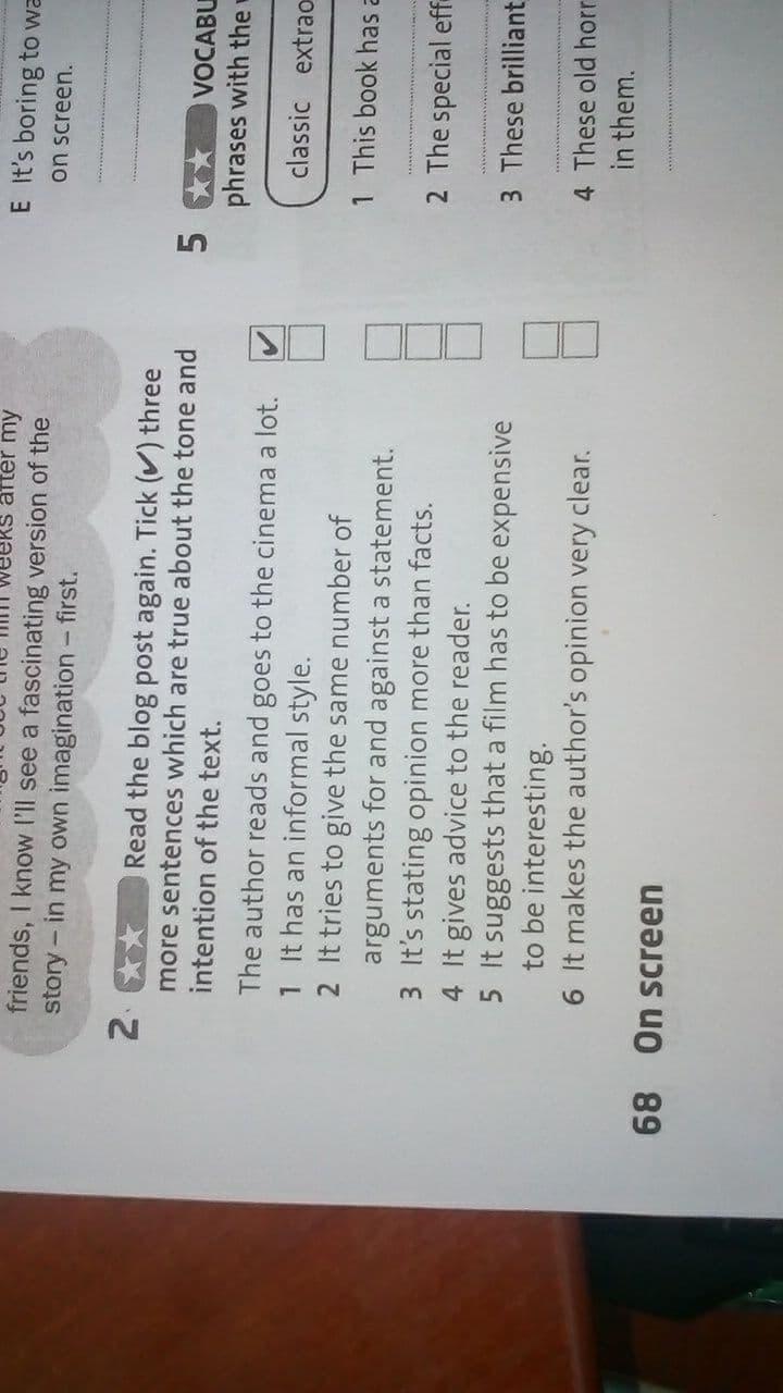 В задании гласит,что нужно прочитать блог еще раз и зачеркнуть три предложения которые подсказывают мнение автора и намерения текста.